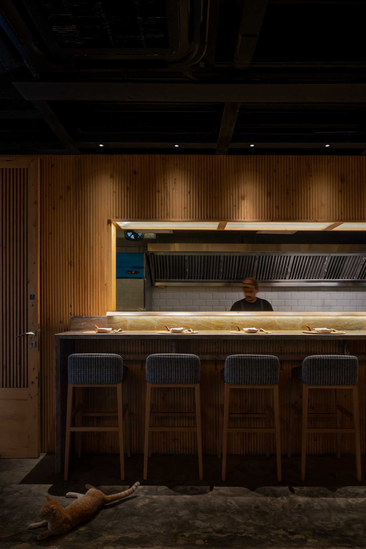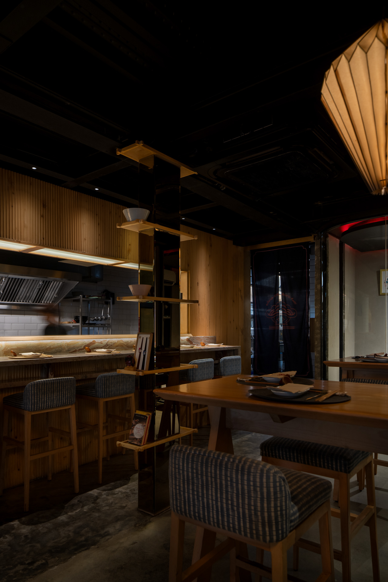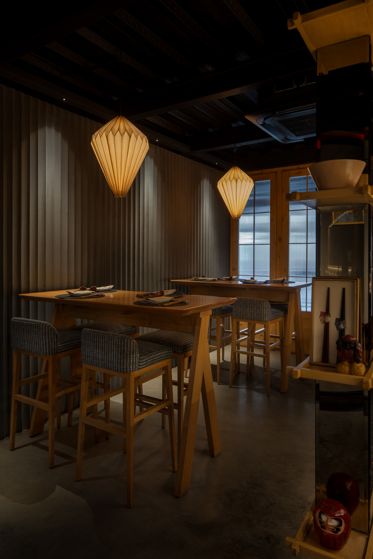 The spatial concept draws inspiration from minkas—light wooden Japanese homes—and the cinematic energy of open kitchens. The long, narrow plan is organised as a linear sequence, fronted by fluted glass and timber doors, culminating in the chef-led counter. Diners sit face-to-face with the kitchen, turning the act of cooking into performance. At the heart of the space, the Japanese noodle-making machine is deliberately exposed—not just as a functional element, but as a design feature—its rhythm and precision becoming part of the dining theatre.